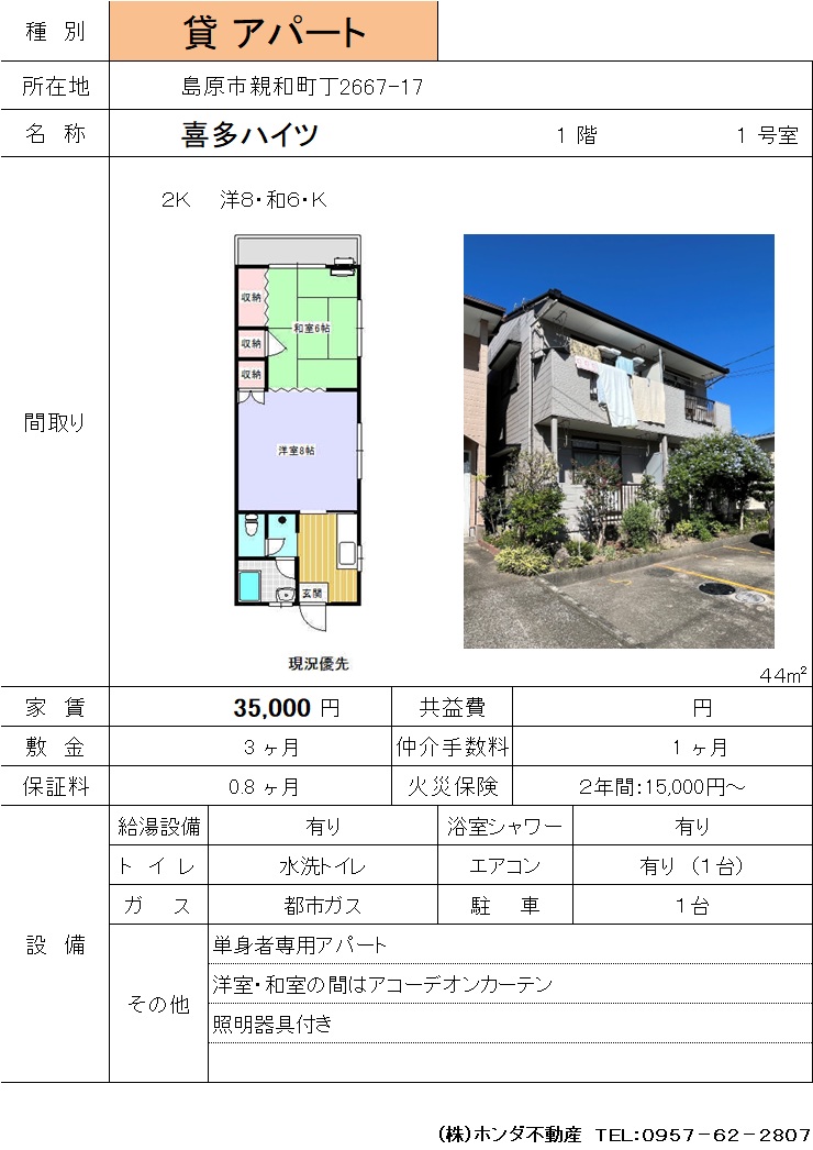 | 島原市親和町丁2667-17 | 喜多ハイツ 1号室 | アパート | 35,000 | 3ヶ月 | 2K | |