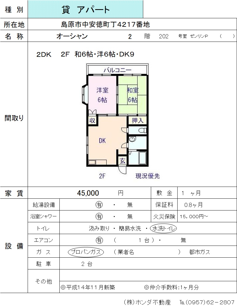| 島原市中安徳町丁4217 | オーシャン 202号室 | アパート | 45,000 | 1ヶ月 | 2DK | |
