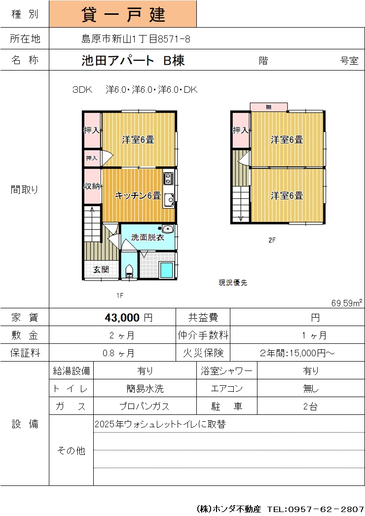 | 島原市新山1-8571-8 | 池田アパート B棟 | 一戸建て | 43,000 | 2ヶ月 | 3DK | |