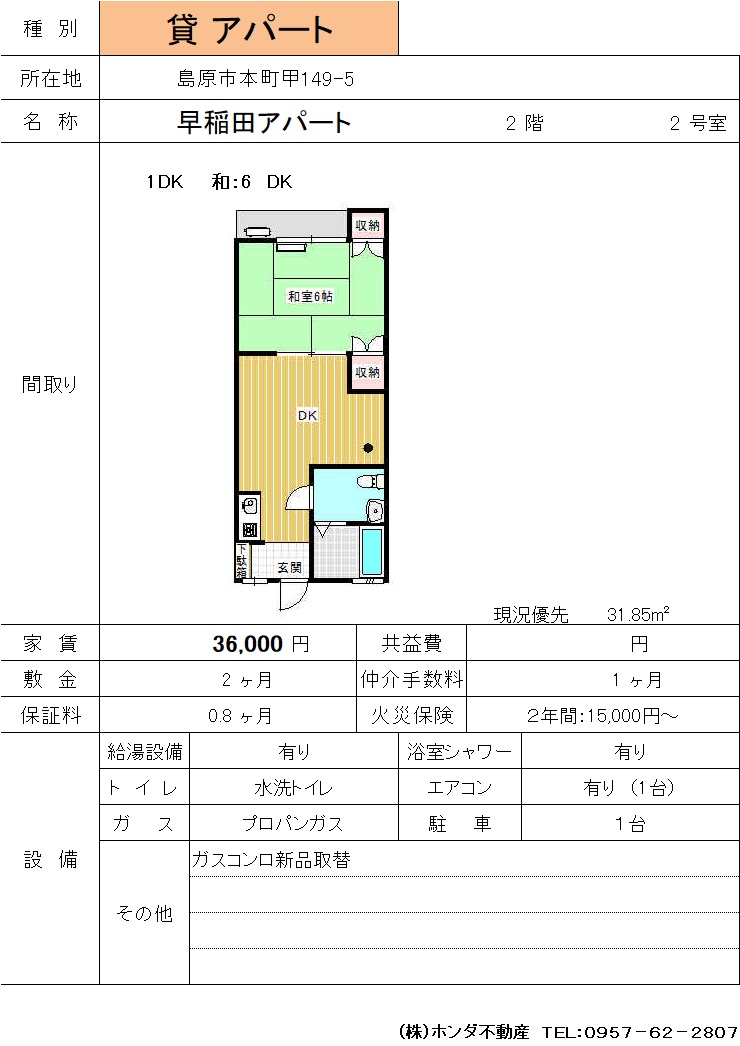| 島原市本町甲149-5 | 早稲田アパート 2号 | アパート | 36,000 | 2ヶ月 | 1DK | |