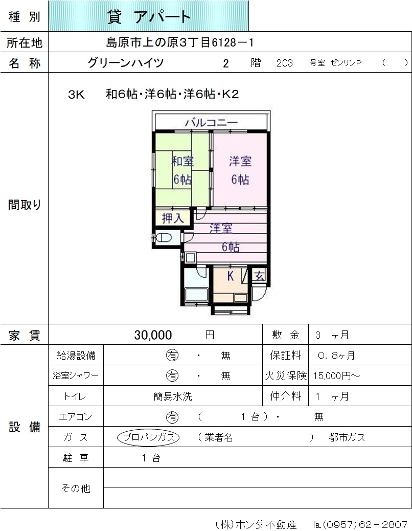 | 島原市上の原3-6128-1 | グリーンハイツ203号室 | アパート | 30,000 | 3ヶ月 | 3K | |
