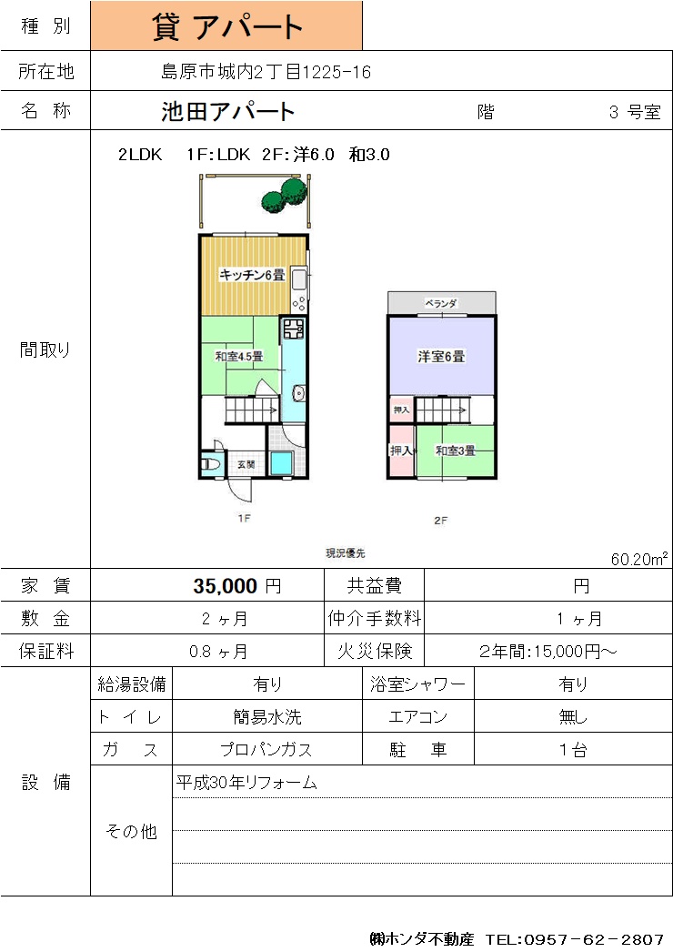 | 島原市城内2-1225-16 | 池田アパート3号 | アパート | 35,000 | 2ヶ月 | 2LDK | |