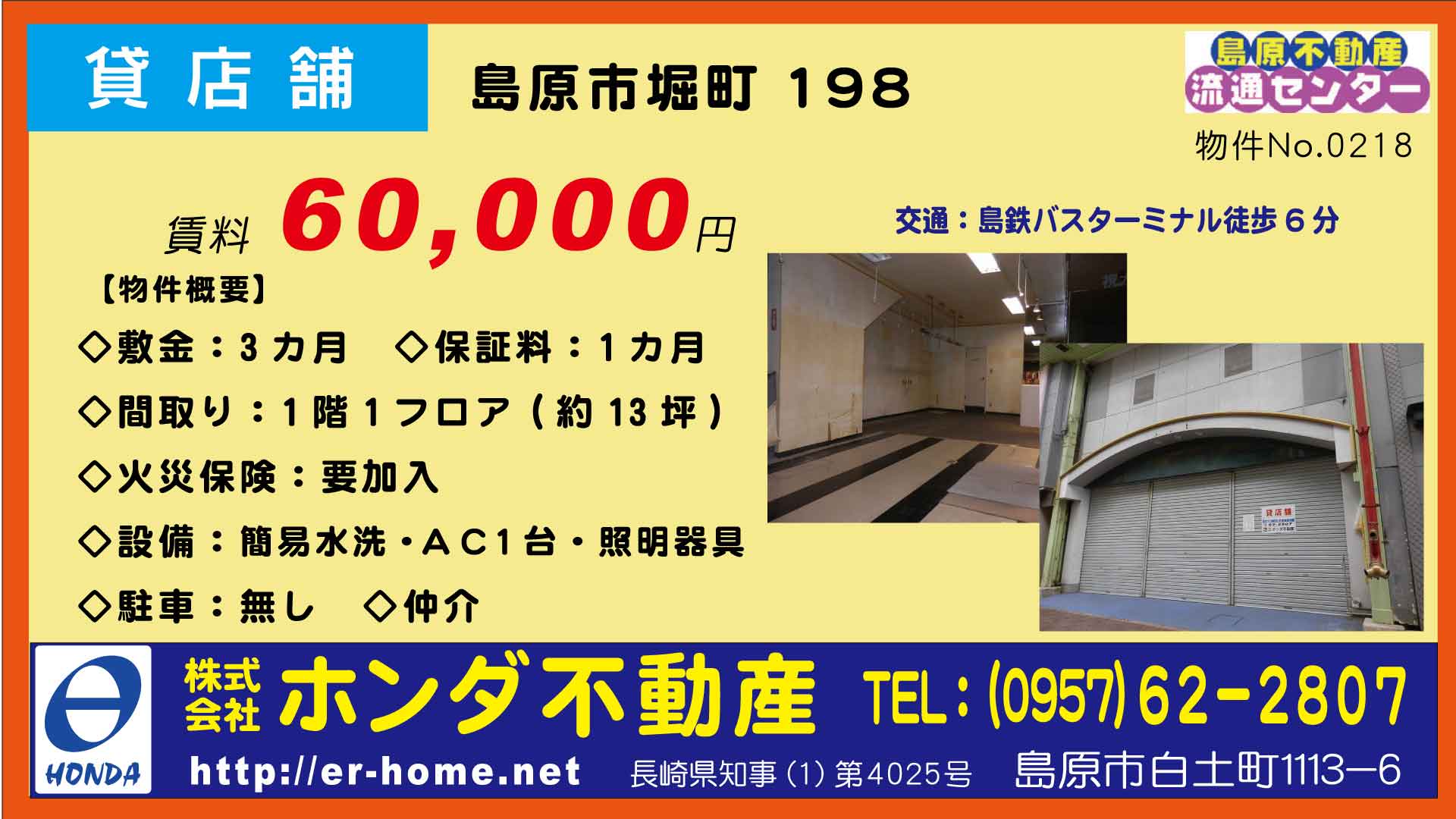 | 島原市堀町198 | 貸店舗 栄木テナント | テナント | 60,000 | 3ヶ月 | ||