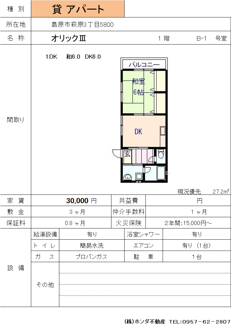 | 島原市萩原3-5800 | オリックⅢ B-1 | アパート | 30,000 | 3ヶ月 | 1Dk | |