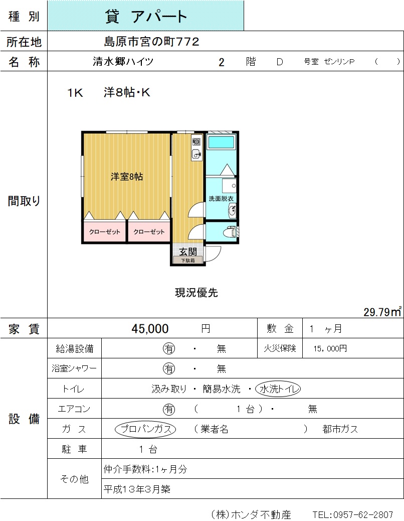 | 島原市宮の町772 | 清水郷ハイツ D号室 | アパート | 45,000 | 1ヶ月 | 1K | |