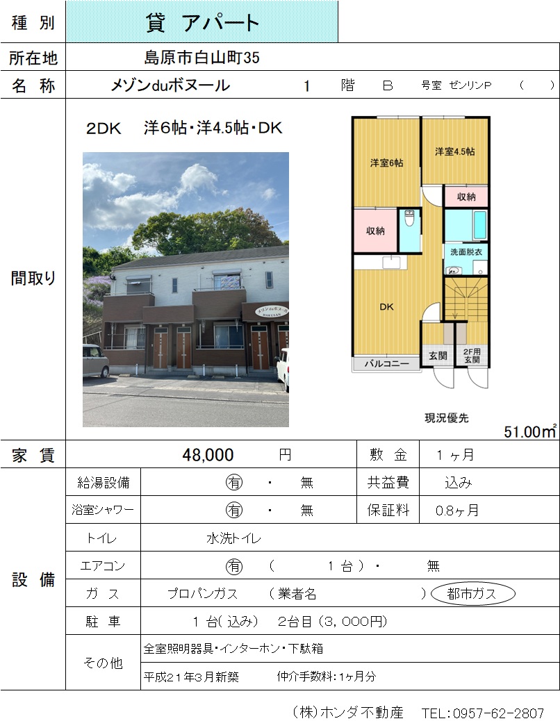 | 島原市白山町35 | メゾンduボヌール B号室 | アパート | 48,000 | 1ヶ月 | 2DK | |