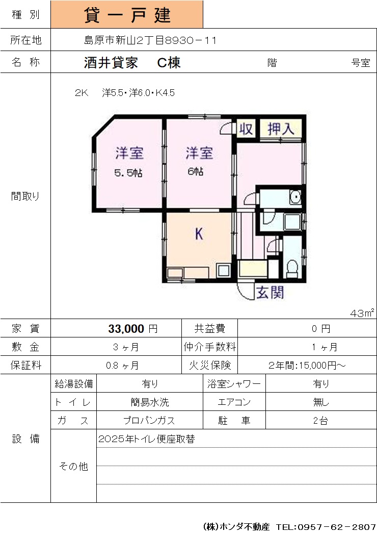 | 島原市新山2-8930-11 | 酒井貸家C棟 | 一戸建て | 33,000 | 3ヶ月 | 2K | |