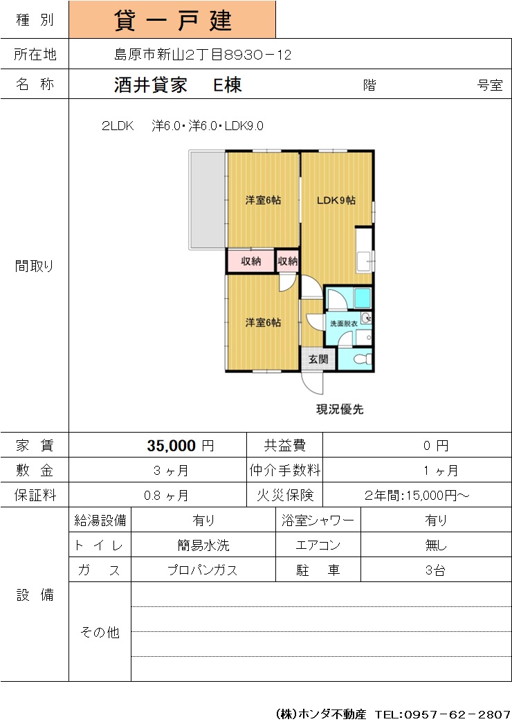 | 島原市新山2-8930-12 | 酒井貸家E棟 | 一戸建て | 35,000 | 3ヶ月 | 2LDK | |