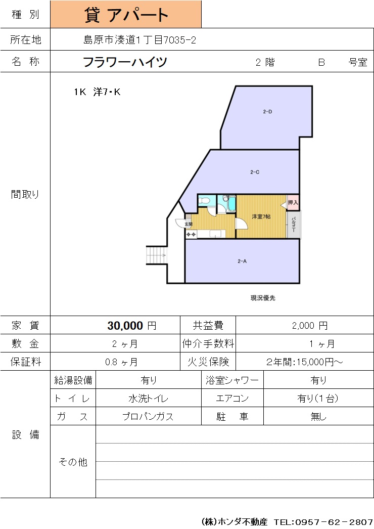 | 島原市湊道1-7035-2 | フラワーハイツ2-B | アパート | 30,000 | 2ヶ月 | 1K | |