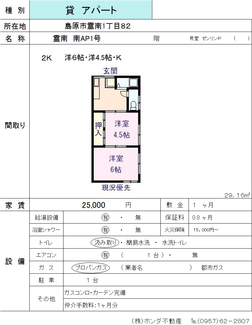 | 島原市霊南1丁目 | 霊南 南AP2号 | アパート | 25,000 | 1ヶ月 | 2K | |