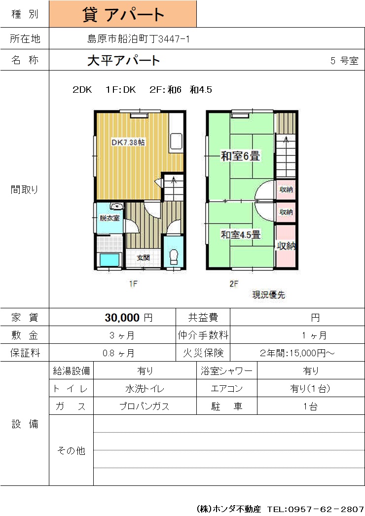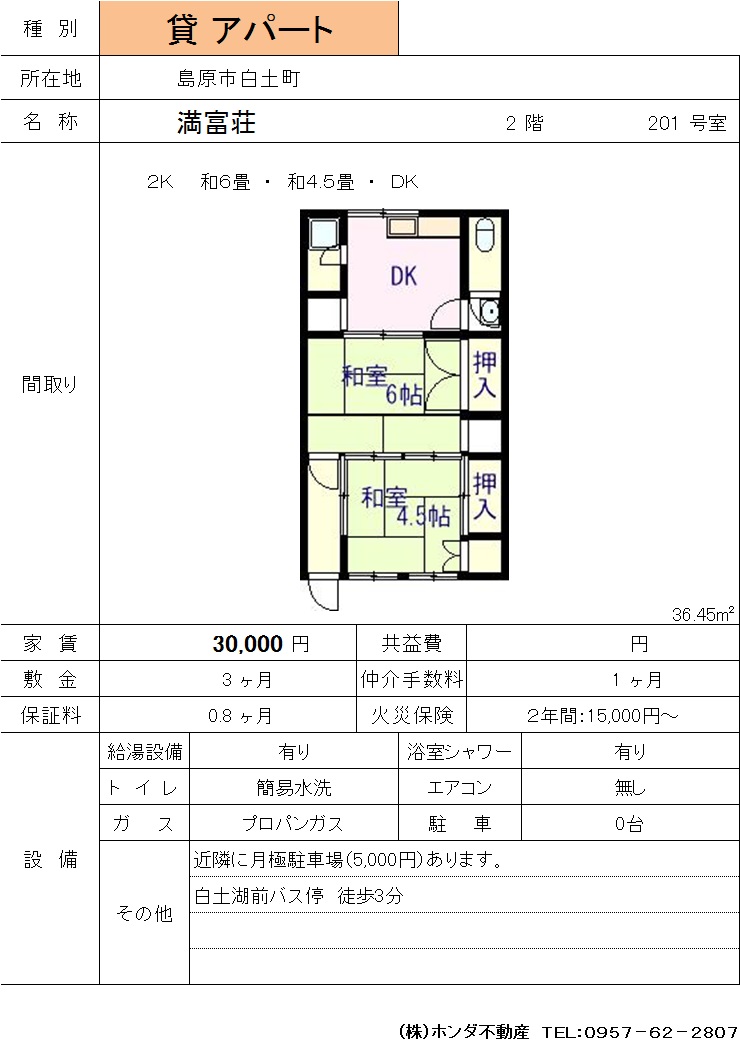 | 島原市白土町 | 満富荘201号室 | アパート | 30,000 | 3ヶ月 | 2DK |