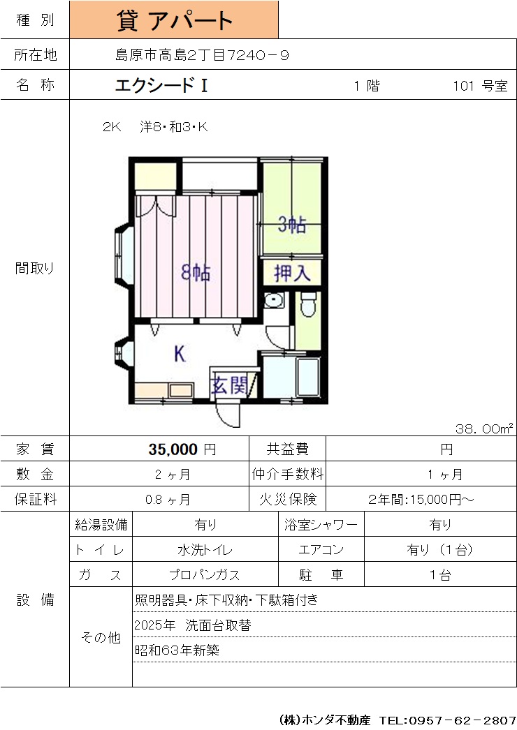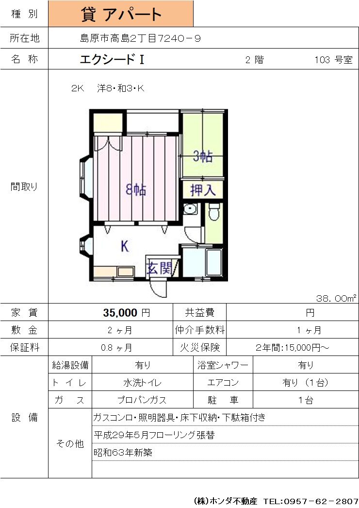 | 島原市高島2丁目7240-9 | エクシードⅠ 103号室 | アパート | 35,000 | 2ヶ月 | 2K | |