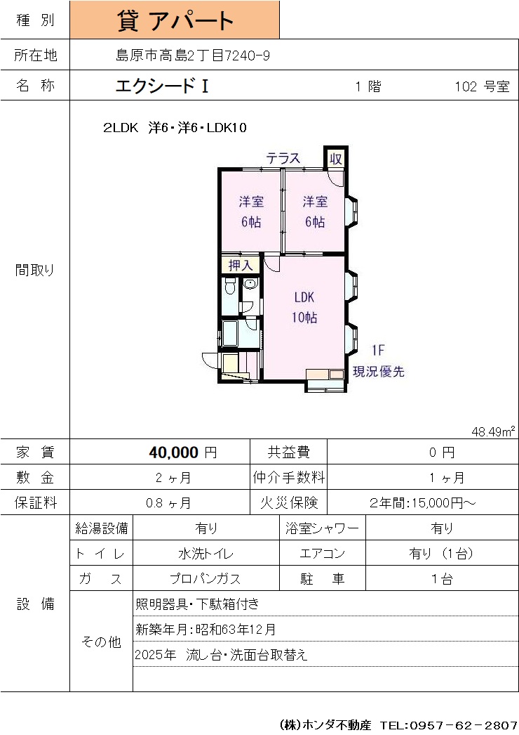 | 島原市高島2丁目7240-9 | エクシードⅠ 102号室 | アパート | 40,000 | 2ヶ月 | 2LDK | |