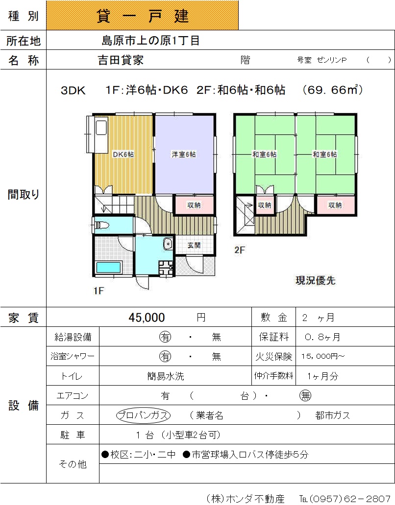| 島原市上の原1-6265-3 | 吉田貸家 | 一戸建て | 45,000 | 2ヶ月 | 3DK | |