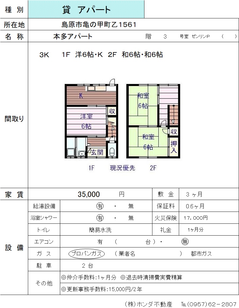 | 島原市亀の甲町乙1561 | 本多アパート3号 | アパート | 35,000 | 3ヶ月 | 3K | |