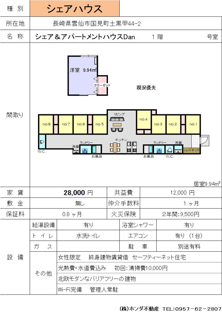 | 雲仙市国見町土黒甲44-2 | シェア&アパートメントハウスDan 女性専用シェアハウス | シェアハウス | 28,000 | 無し | ||